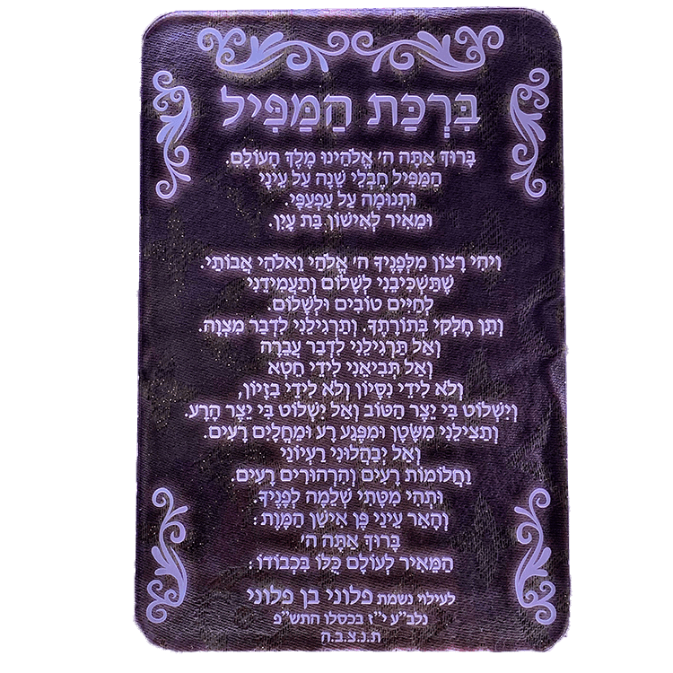 בָּרוּךְ אַתָּה ה' אֱלֹהֵינוּ מֶלֶךְ הָעוֹלָם. הַמַּפִּיל חֶבְלֵי שֵׁנָה עַל עֵינָי וּתְנוּמָה עַל עַפְעַפָּי. וּמֵאִיר לְאִישׁוֹן בַּת עָיִן.