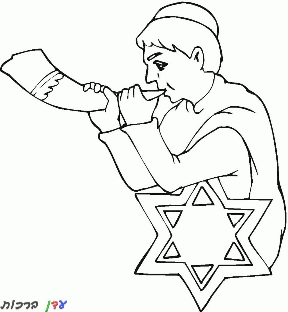 דף צביעה חגי תשרי תקיעה בשופר ולידו מגן דוד